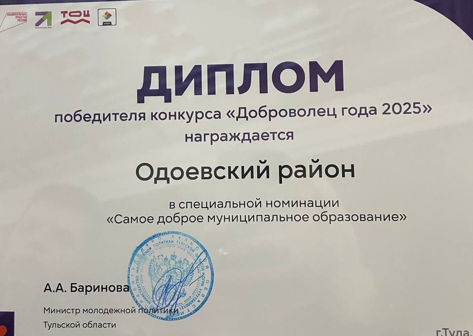 В рамках церемонии награждения ежегодного регионального конкурса «Доброволец года» Одоевский район стал победителем в специальной номинации – «Самое доброе муниципальное образование»...